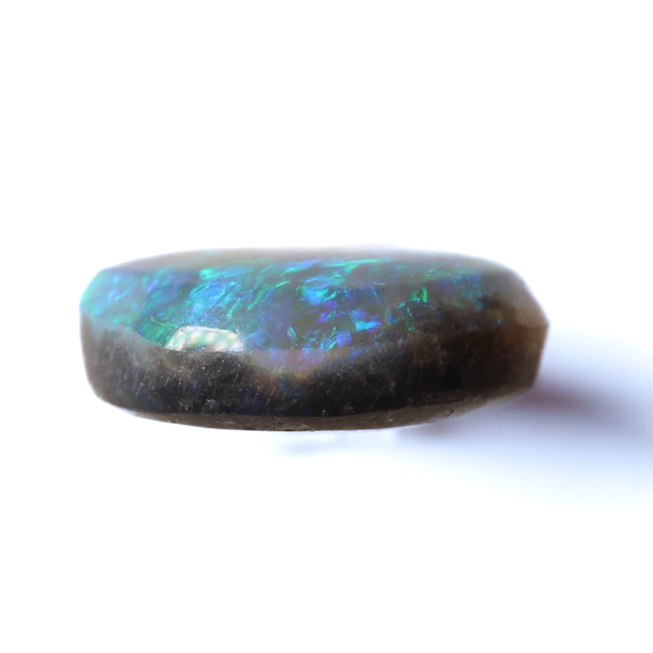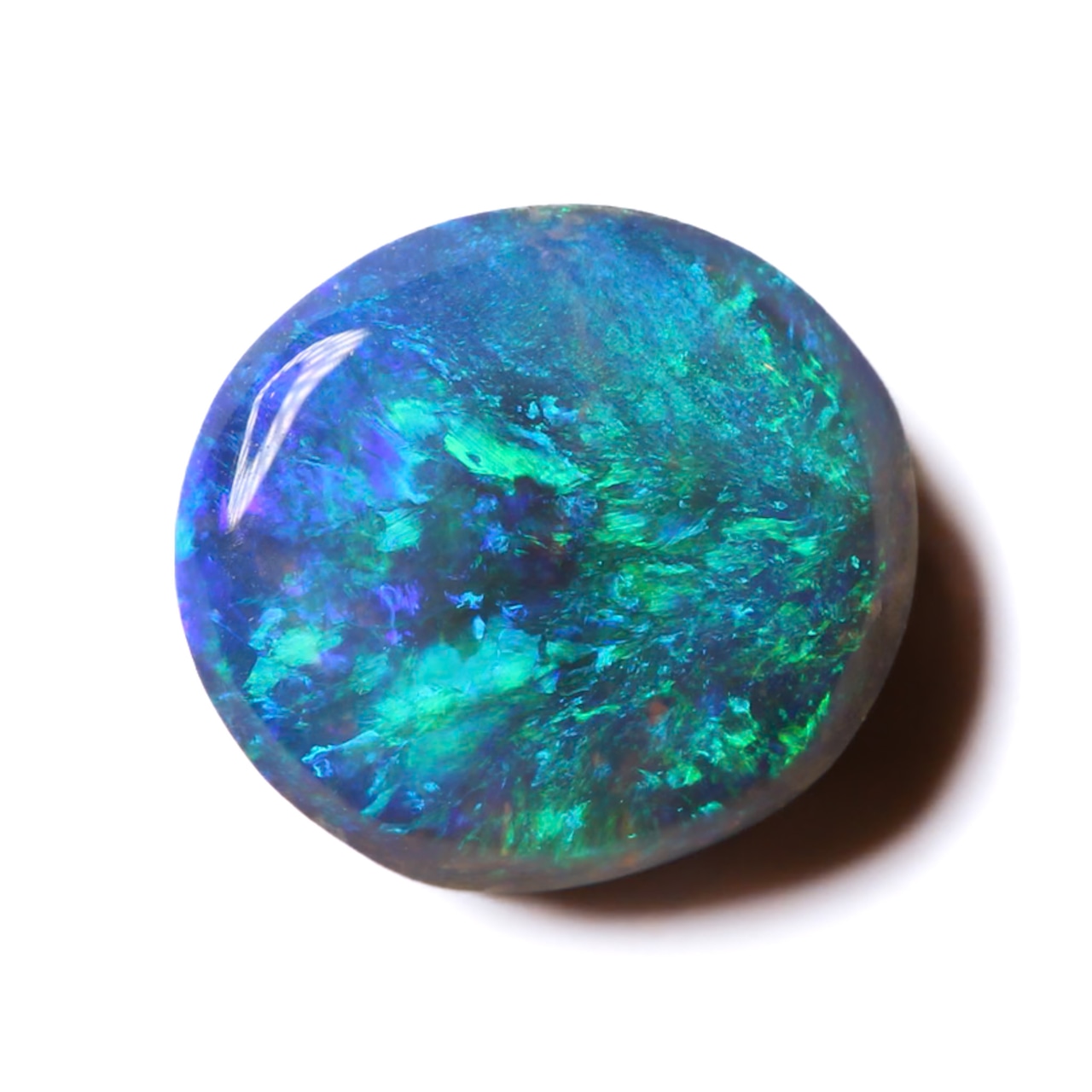 宇宙から見下ろした地球を思わせる鮮やかなカラーリングとフォルムが大変美しいオパールで、縦横斜めどの角度からも鮮やかな遊色を見ることができます。彩度の高いシアンブルーやネオングリーンがさまざまな方向から混ざりあい、ポイントポイントに濃くクッキリとしたコバルトブルーが差し色的に入ることでバランスの取れた美しい斑立ちになっています。