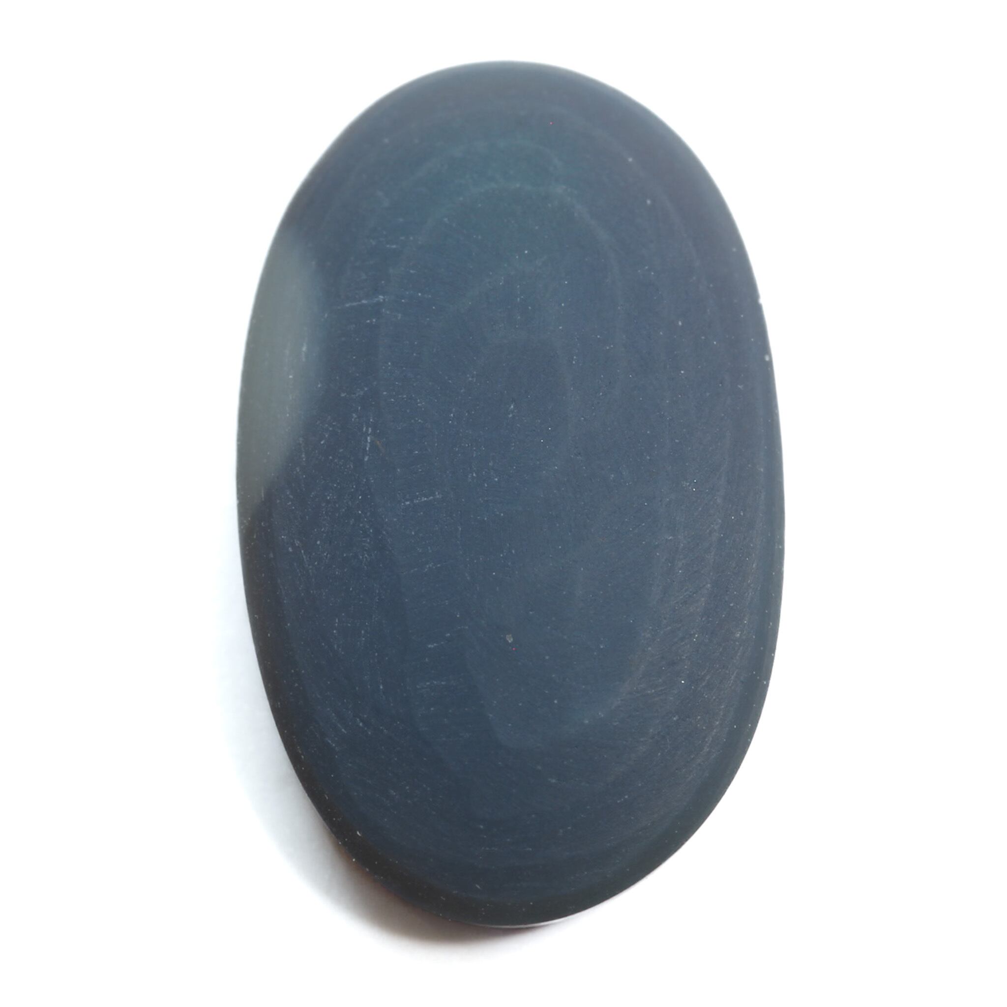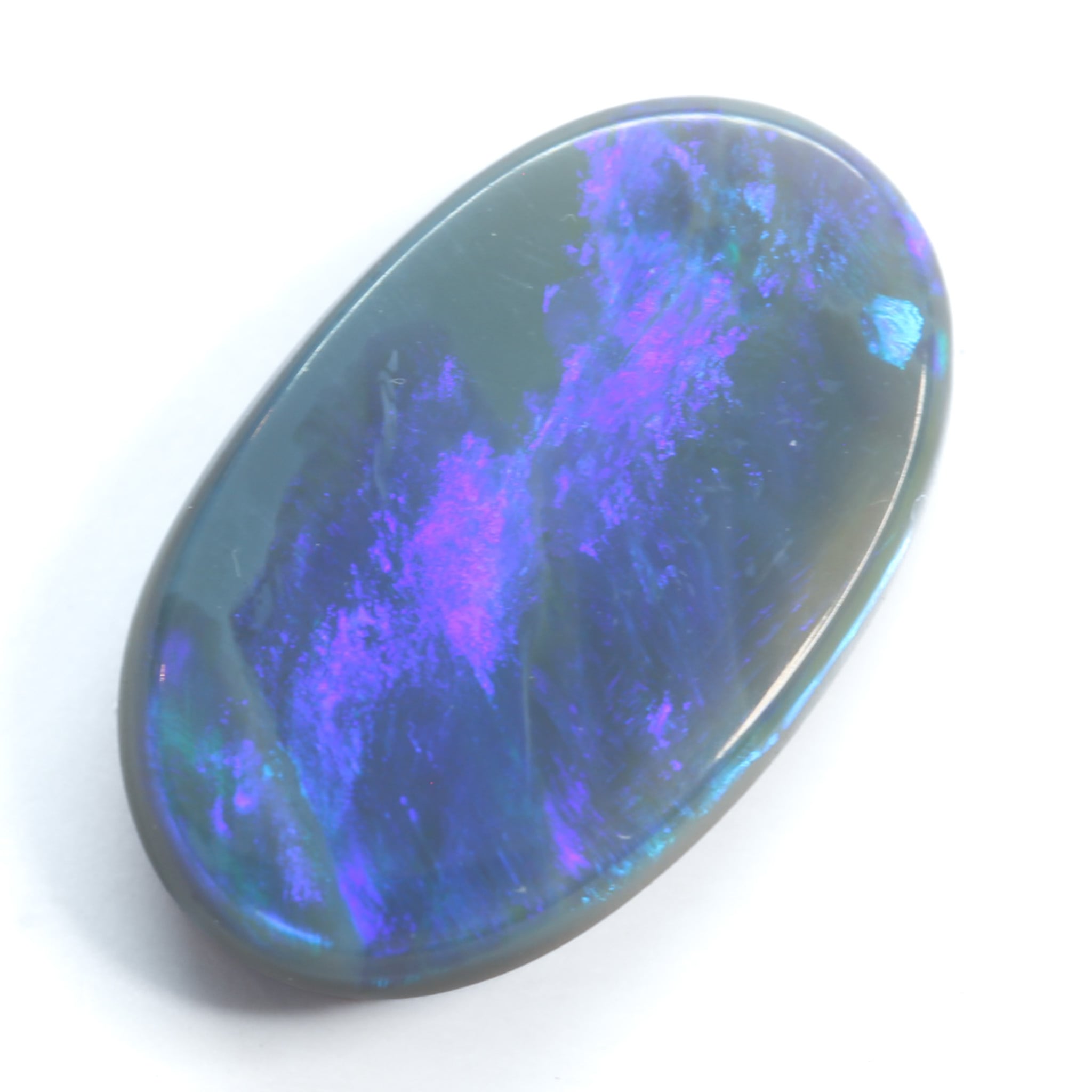 曇天の隙間から覗く夜空や、光を受ける鴉の羽を連想させるネオンパープルとシアンの遊色、ブラックグレーのポッチ(遊色のないオパールの部分)の組み合わせがロマンチックです。寒色に統一されたカラーリングのイメージから、ルースに触れた感覚もどことなくひんやりとした肌触りに感じられるかもしれません。