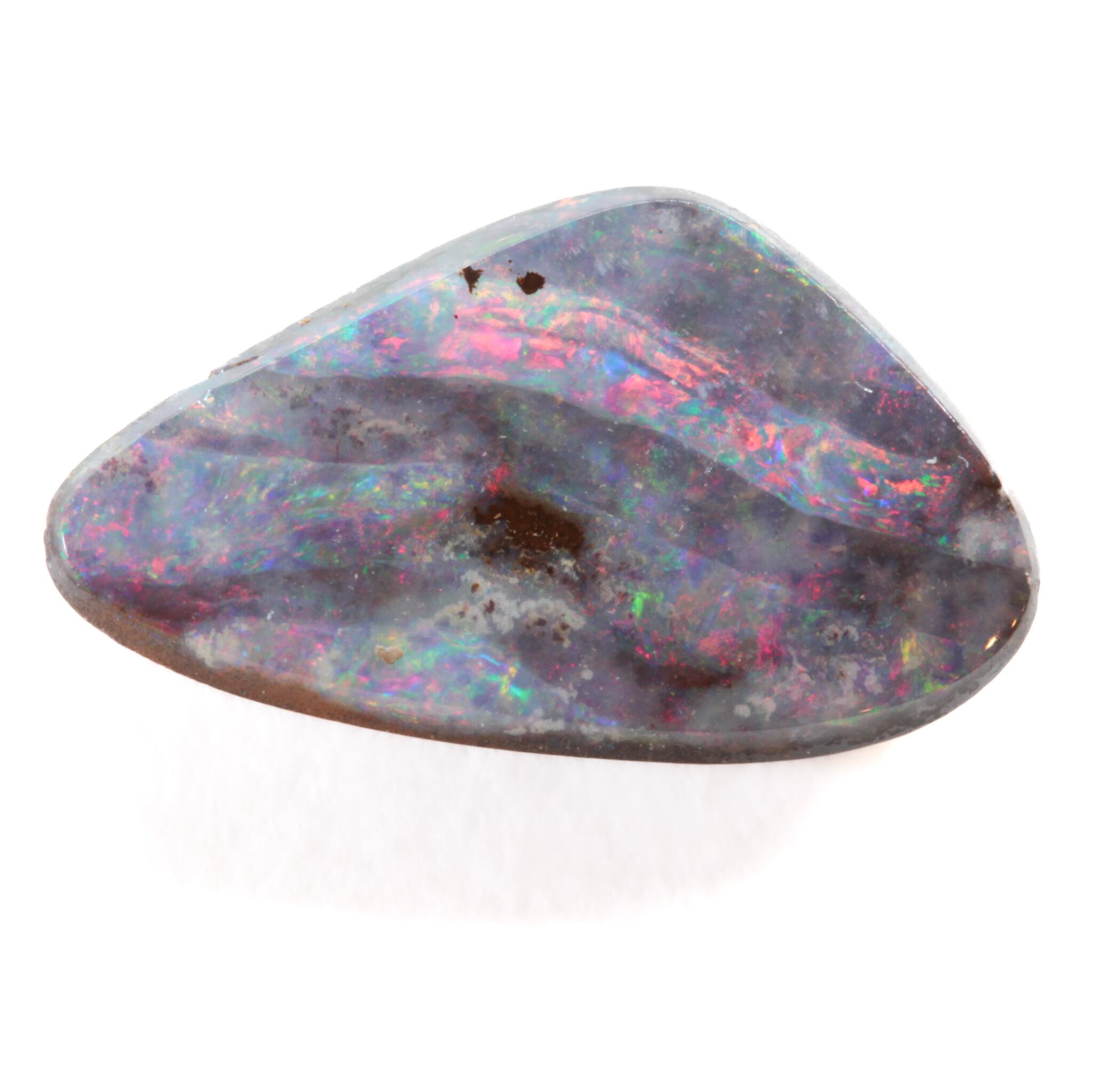 乳白色のベール層の下から母岩がうっすら透けたり点々とアクセントを残すことで「ボルダーオパールらしさ」を石の表情から存分に楽しむことの出来る、大変個性のあるルースになっています。