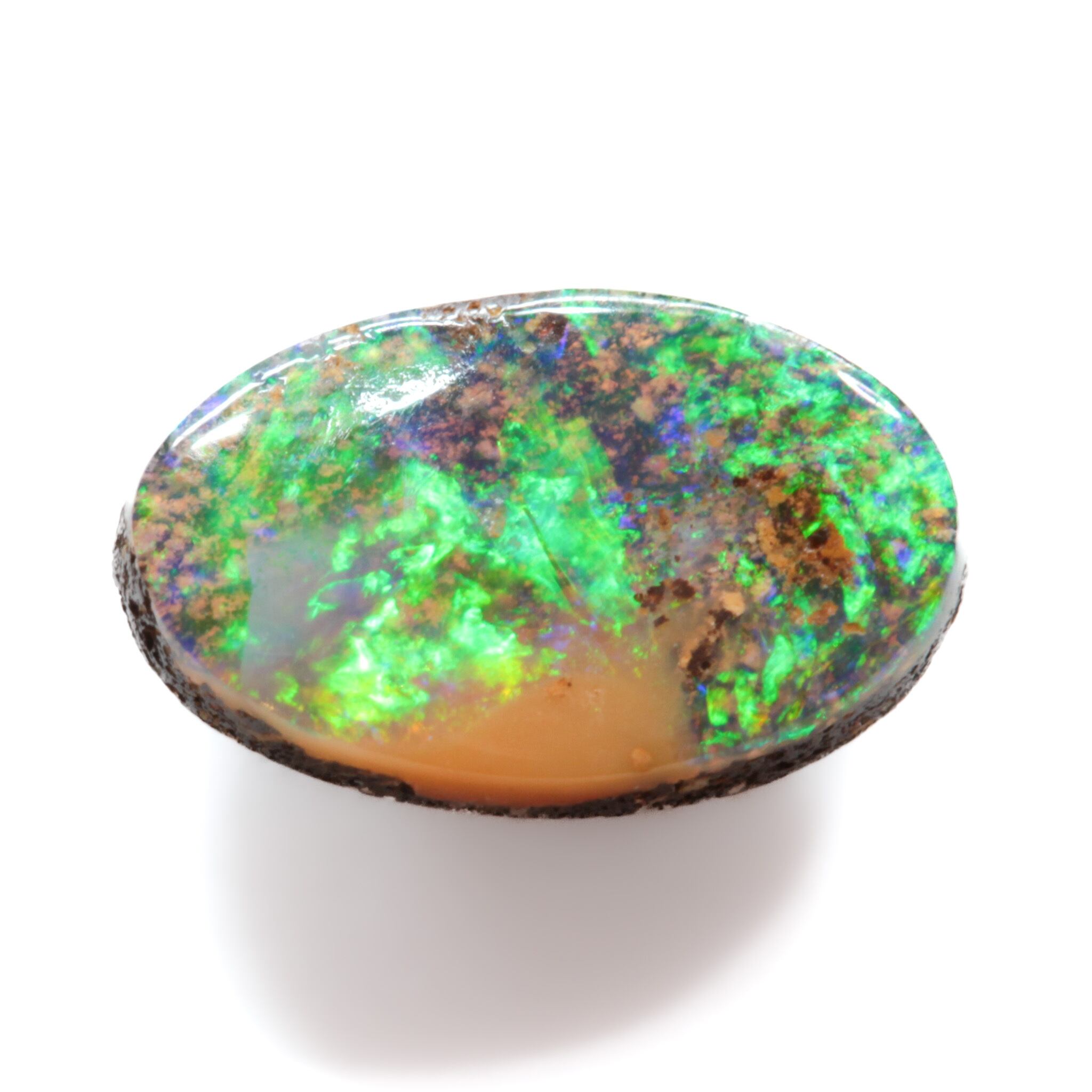 母岩の地のブラウンと、一見箔押しのホログラムを圧着させたかのように眩い色の対比を楽しむ、パーティーカラーのグリーンが目を惹くボルダーオパールです。
