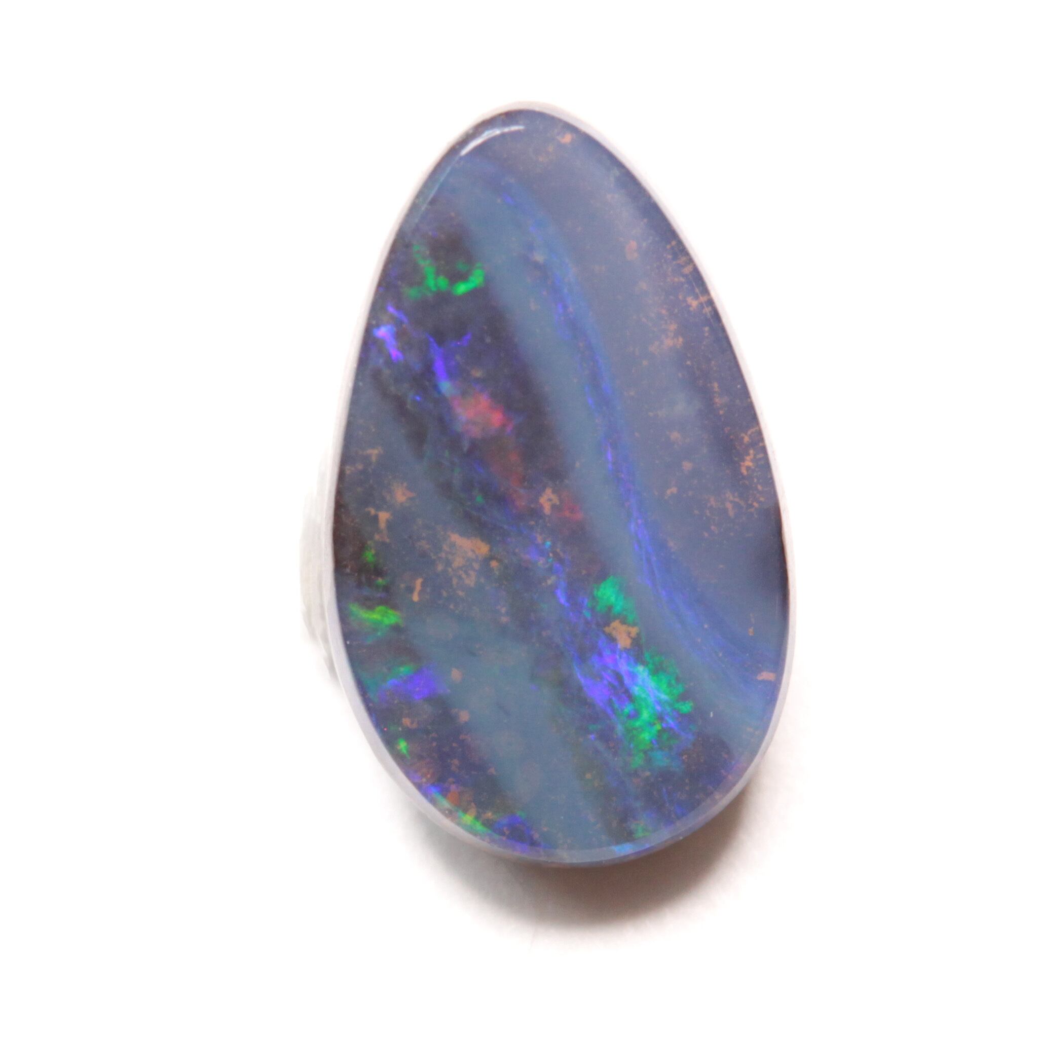 群青色に雫型のシェイプと波模様の特徴が抽象的な雨のイメージを思わせるボルダーオパールです。