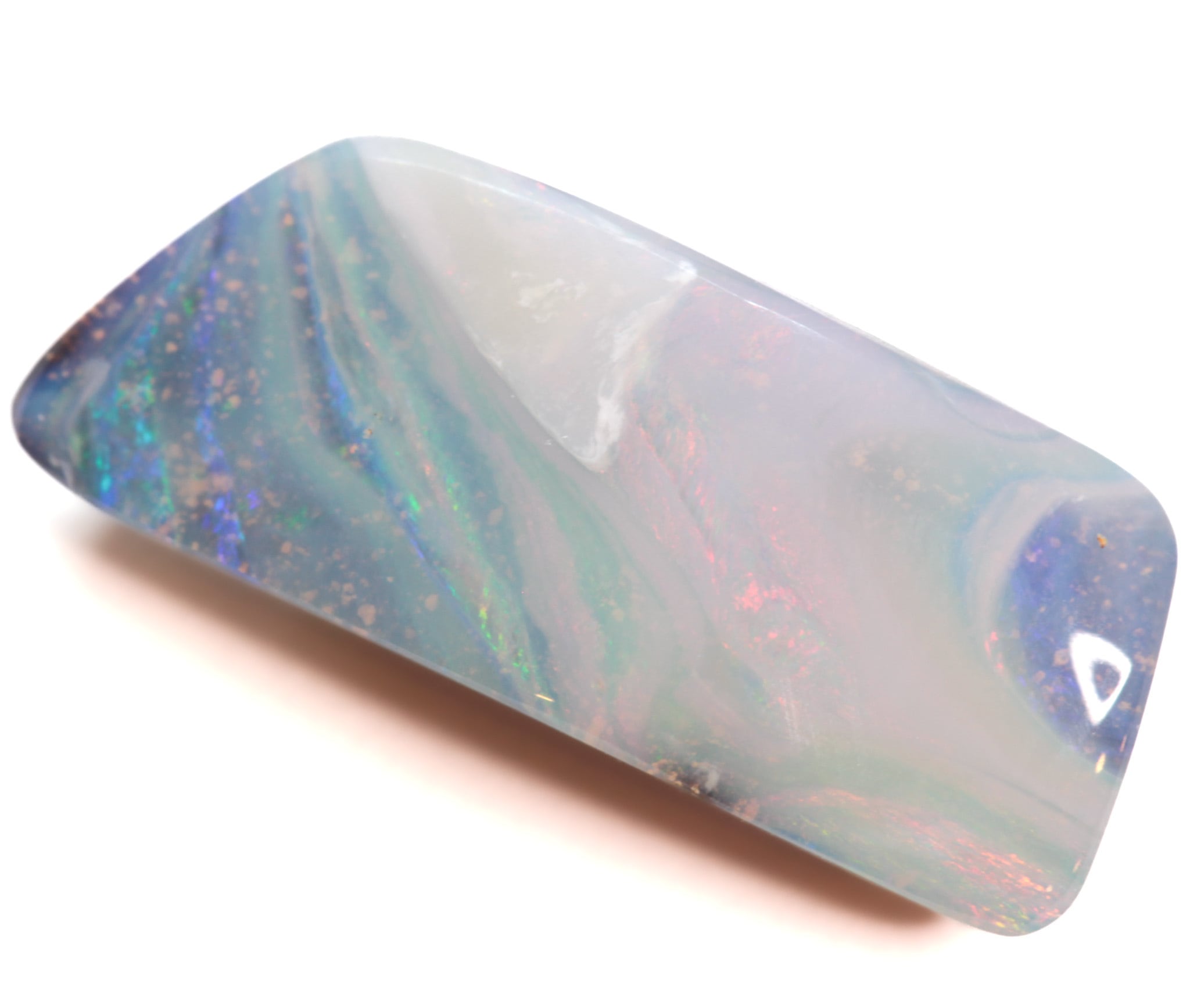 母岩の厚さに対して遊色層が厚めなことでルースにリッチさを感じさせるだけでなく、ピクチャータイプのボルダーオパールの中でも絵画というより風景を感じ取れるルースになっており、全体的にやわらかくパステル調な色合いが優しい雰囲気を醸します。