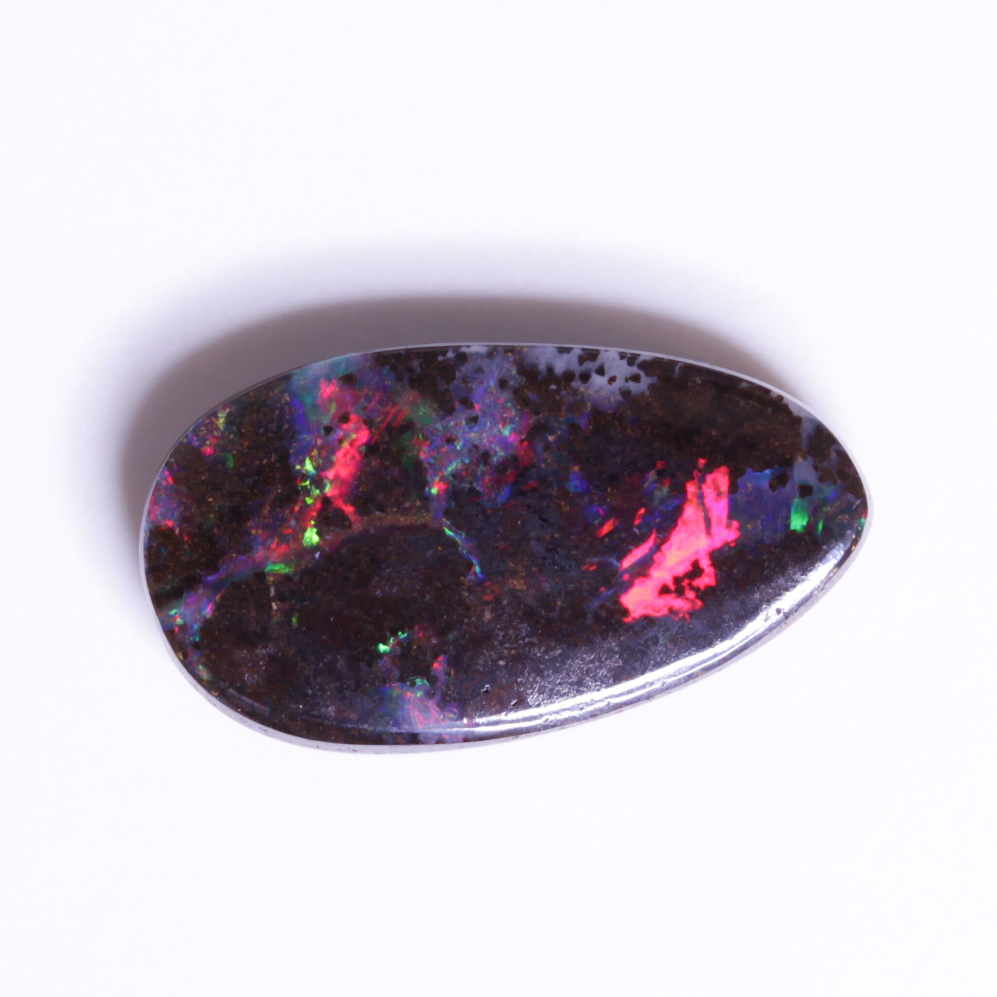 一見ブラックオパールと見間違えそうな程真っ暗な母岩の色と、母岩の隙間からギラリと主張する赤やライムグリーンの遊色が大変魅力的なルースになっており、マトリックスタイプ(母岩の隙間から遊色が網目状に見られるボルダーオパールの一種)のルースの中でもハイグレードな逸品です。