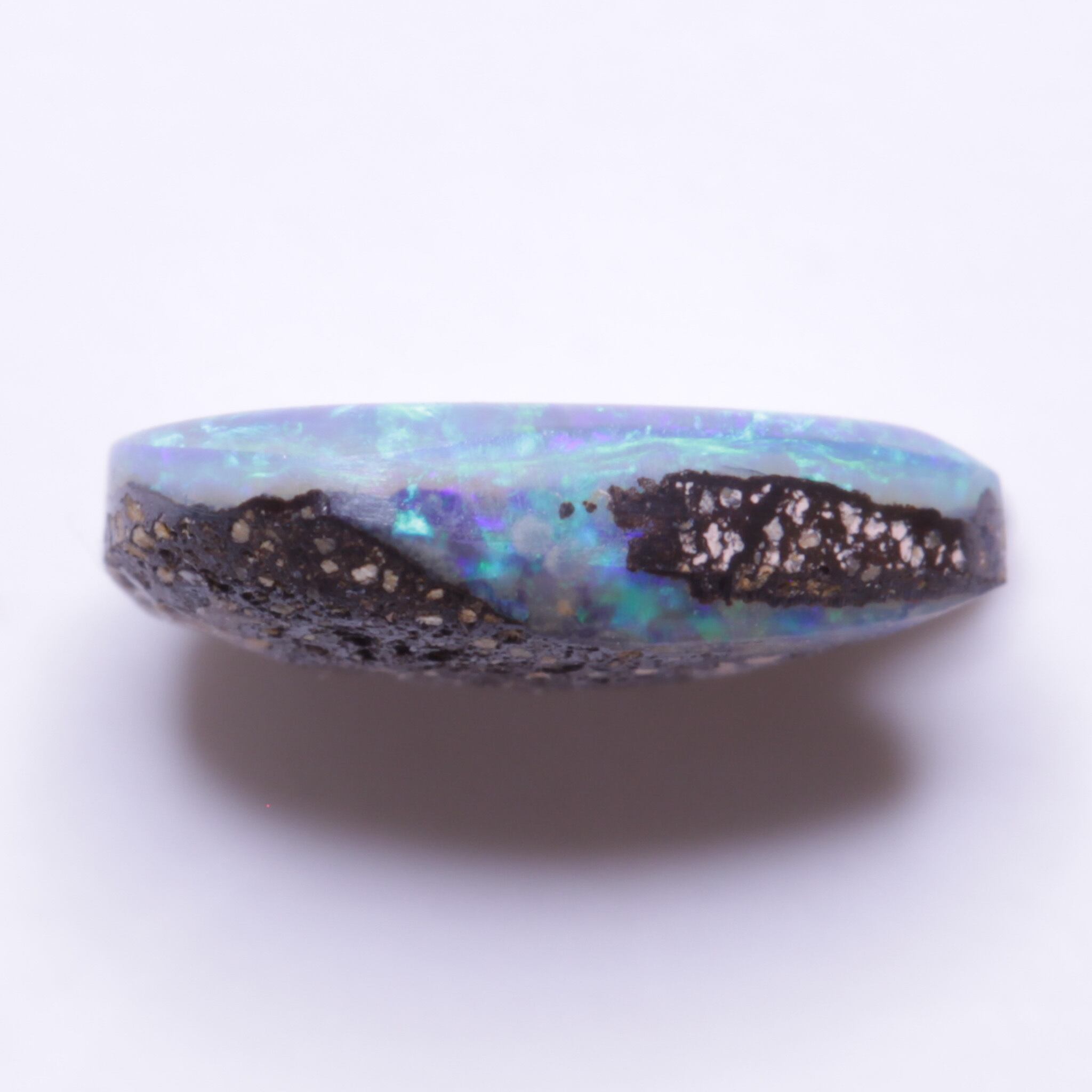 ルースの正面からの表情を捉えた時にエメラルドグリーンとシアンのシャフパターン(もみ殻のようなオパールの模様)の更に奥に母岩の一部が透けて見え、まるで澄んだ池のジオラマを覗き込んでいるような趣きを感じさせます。