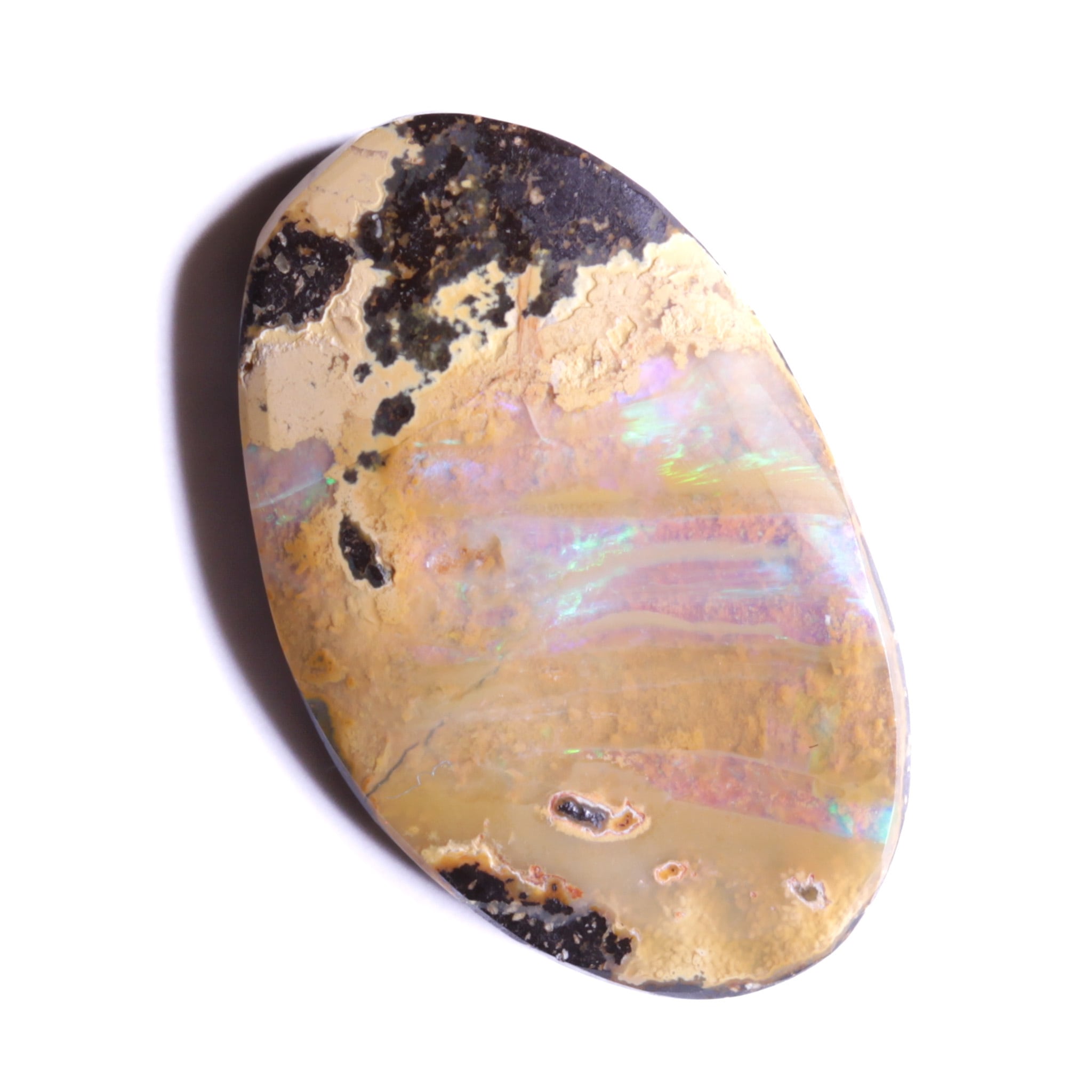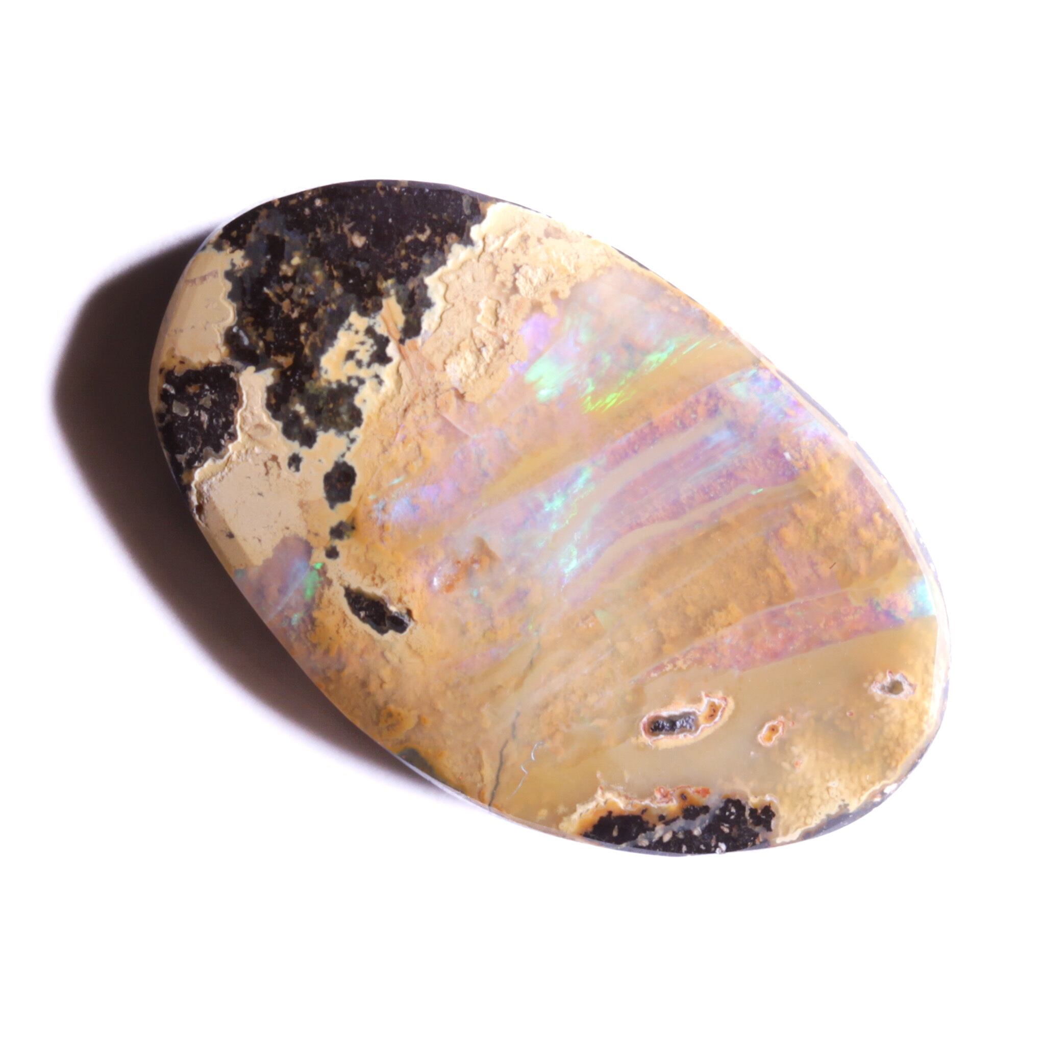 遊色の出ないオパール層へ母岩の褐色がしみ出して独特なペールオレンジがかった色が現れており、更に遊色の出る透明なオパール層と合わさる事でこのルースの独特な表情を醸し出しています。