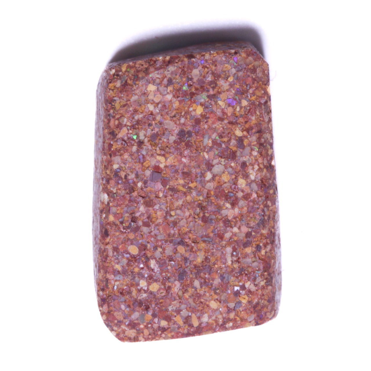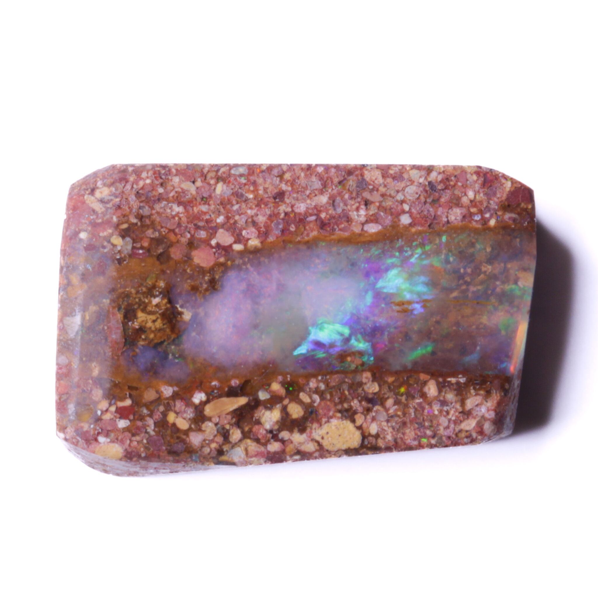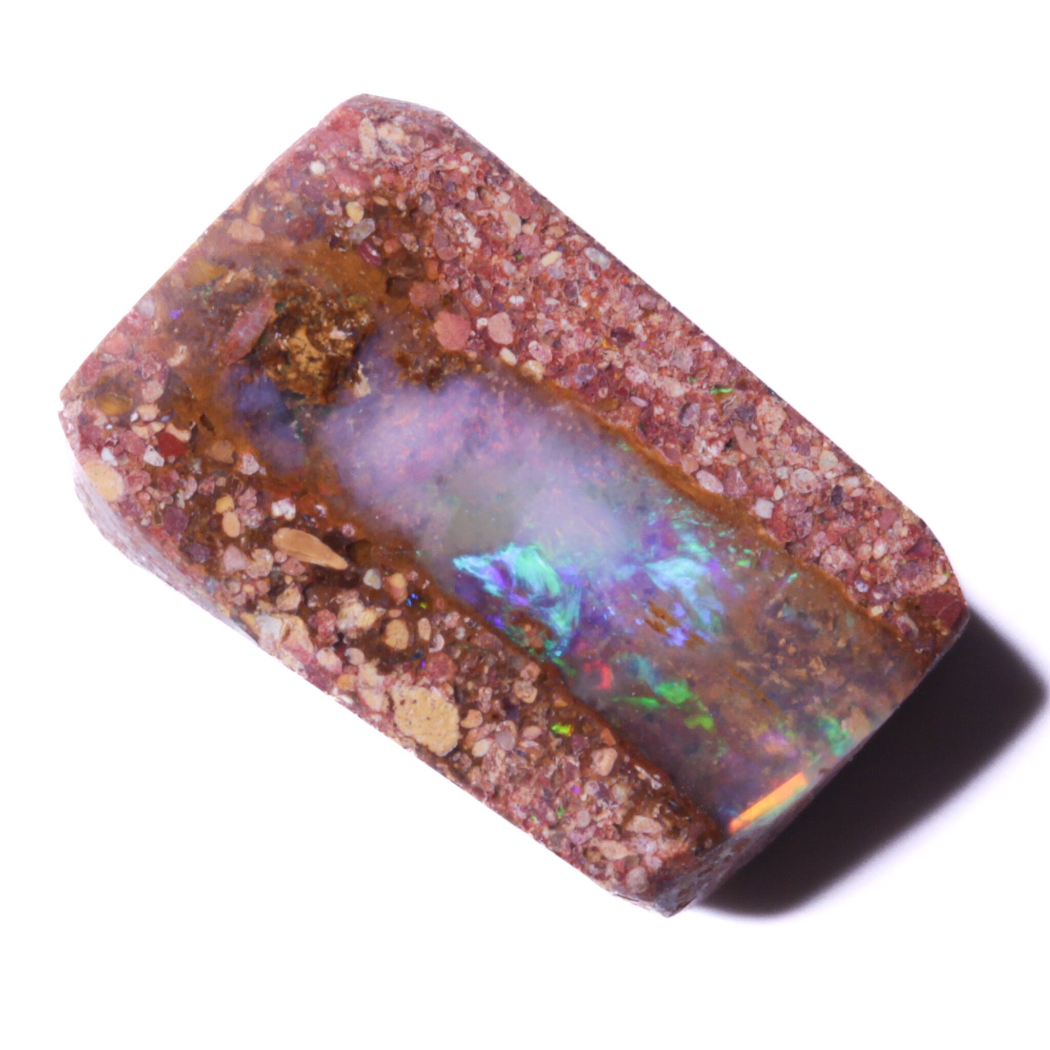 ルースの表面はなめらかに研磨が施されており、パイプ状に入り込んだオパールの遊色を鑑賞できるだけでなく、染み込んだオパールが母岩の砂粒と砂粒の隙間からもキラキラと虹色に輝いているのが分かります。